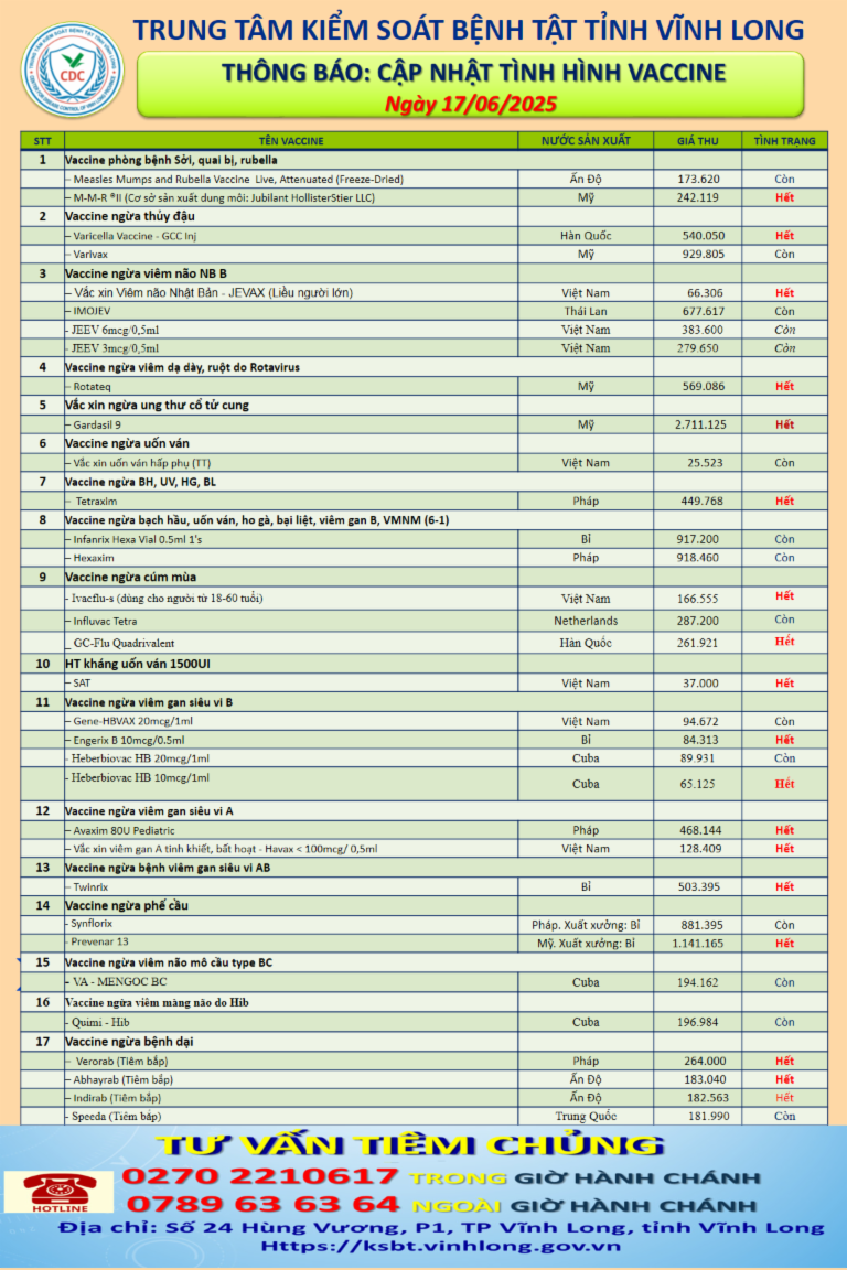 - Cập nhật tình trạng, giá vắc xin ngày 17-06-2025 (17/06/2025)